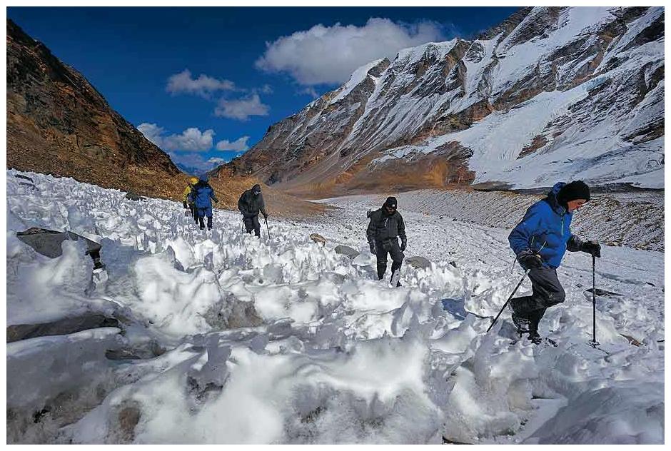 The glacier flows to the south for a short distance of about 3 km, 0.25 km in breadth and gives rise to the Pindari River which meets the Alakananda at Karnaprayag in Garhwal district. The Pindari trek offers serenity and tranquility along with the spectacular mountain scenery. It lies between the Nanda Devi and Nanda Kot peaks and terminates at an altitude of 3627 m.