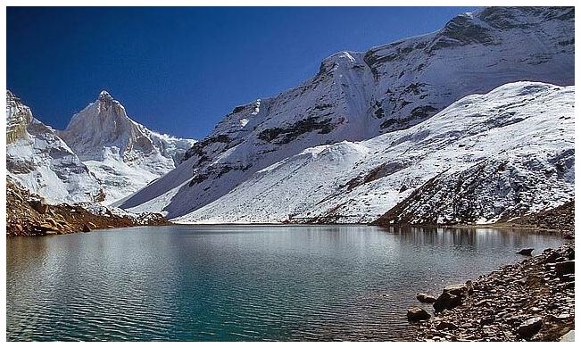 Vasuki Tal is surrounding with very high mountains and provides beautiful view of several peaks of Himalayas. This is the lake where Lord Vishnu is believed to have bathed in ancient times. Crystal clear water flowing through the lake revealing the rock stacks inside is an amazing view in Vasuki Tal. This beautiful lake provides a charming view of the neighboring Chaukhamba peaks. There are several beautiful, colorful flowers around the Vasuki Tal and one of the famous flowers is Brahma Kamal. During winter the lake it is completely frozen.